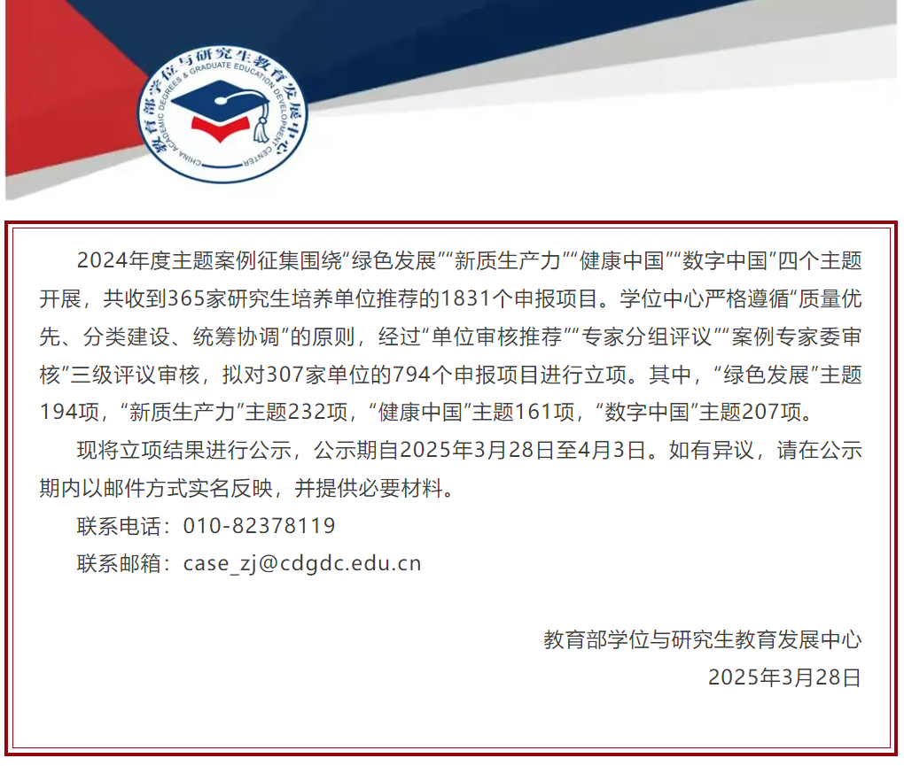 本次主题案例征集工作由教育部学位与研究生教育发展中心(简称“学位中心”)发起,围绕“绿色发展”“新质生产力”“健康中国”“数字中国”四个主题展开,共收到365家研究生培养单位推荐的1831个申报项目。学位中心严格遵循“质量优先、分类建设、统筹协调”的原则,经过“单位审核推荐”“专家分组评议”“案例专家委审核”三级评议审核,拟对307家单位的794个申报项目进行立项。其中,“绿色发展”主题194项,“新质生产力”主题232项,“健康中国”主题161项,“数字中国”主题207项。