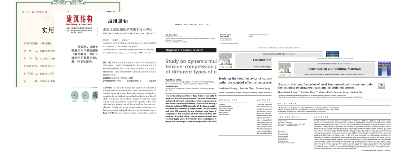 1. Huaishuai Shang, Junhao Zhou, Guotao Yang. Study on the bond behavior of corroded steel bars embedded in concrete under the coupled effect of reciprocating loads and chloride ion erosion [J]. Construction and Building Materials. 2021, 305: (SCI检索,IF=6.141).