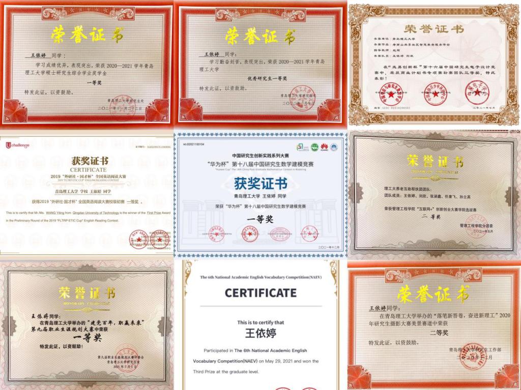 在科技学术上,与课题组成员合作共发表学术论文5篇,其中以第二作者(导师一作)发表SCI检索2篇(1篇Q1, 1篇Q2);积极参加各类竞赛与活动,在校期间累计获得国家级奖励6项,省级奖励2项,校级各类奖励超过10项。曾获得华为杯研究生数学建模竞赛一等奖、中国研究生电子设计竞赛华北赛区三等奖、外研社杯全国英语阅读大赛一等奖等奖项。