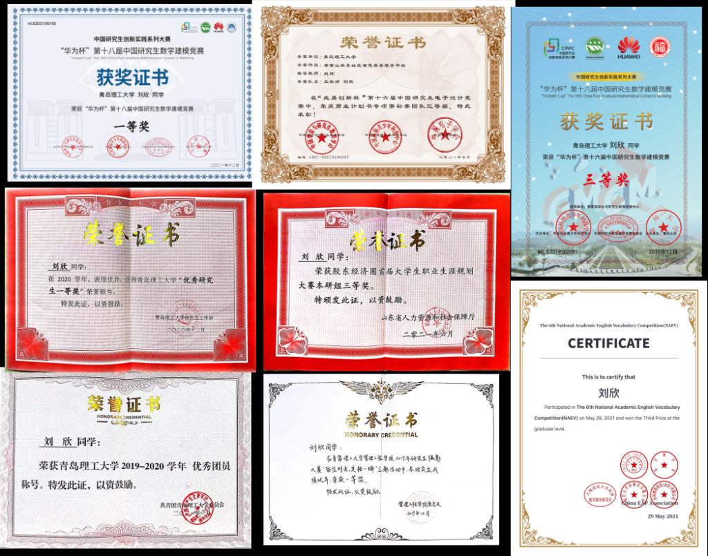 科研方面,与课题组成员合作发表学术论文5篇,其中以第二作者(导师一作)发表SCI检索1篇(Q2);积极参加各类竞赛与活动,在校期间累计获得国家级奖项5项,省级奖项2项,校级奖项10余项。曾获得“华为杯”中国研究生数学建模竞赛一等奖、“兆易杯”中国研究生电子设计竞赛华北赛区三等奖、“胶东经济圈首届大学生职业生涯规划大赛”本研组三等奖等奖项。