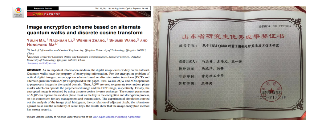 [1] Yulin Ma, Nachuan Li, Wenbin Zhang, Shumei Wang, Hongyang Ma. Image encryption scheme based on alternate quantum walks and discrete cosine transform. Opt. Express, 2021, 29: 28338-28351