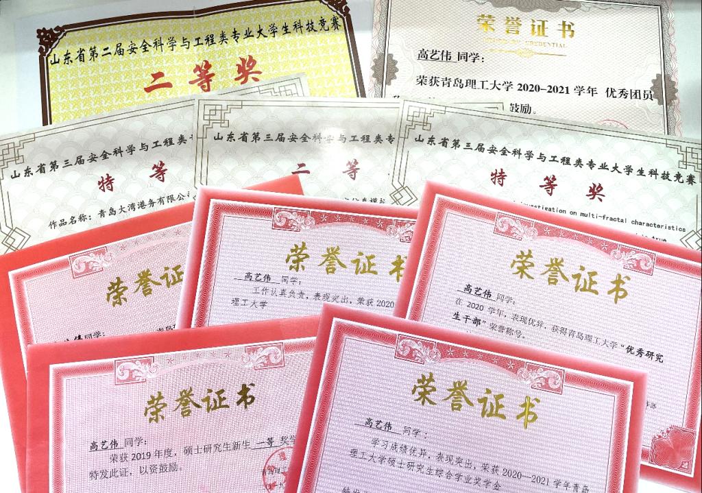[6] 高艺伟 (2/4),青岛大湾港务有限公司汽油罐区火灾模拟及消防设施设计,山东省第三届安全科学与工程类专业科技竞赛特等奖,山东化学化工学会化工安全专业委员会,2020年12月