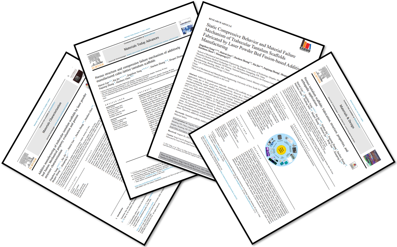 [1] Hairui Gao, Jingzhou Yang, Xia Jin, et al. Porous tantalum scaffolds: Fabrication, structure, properties, and orthopedic applications. Materials & Design(Top), 2021, 210: 110095. (SCI, JCR-Q1, IF=7.991)