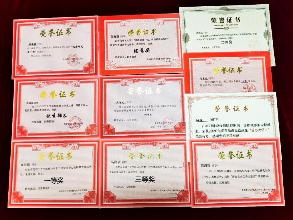 研究生期间,担任班级学习委员(2019.9至今)和院研究生会学术部副部长(2020.9-2021.9)职务,课程成绩加权均分91.9分,综合测评总成绩95.3分,年级排名第一,研究生期间共参与国家自然科学基金项目课题两项,共发表高水平SCI论文5篇(JCR一区4篇,二区1篇),其中第一作者4篇,总影响因子≥30,并且积极参与各项竞赛活动,获得“山东省优秀学生”荣誉、“山东省优秀毕业生”荣誉、研究生国家奖学金、优秀研究生干部、优秀共青团员以及各类校级院级竞赛奖励共计10余项。