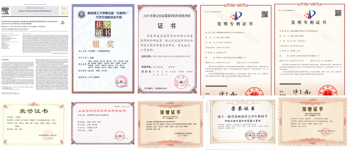 到目前为止,已获得省级、协会奖项5项、校市级奖项多项: 2020年12月获得“山东省高等学校科学技术奖” 一等奖;2020年12月获得“中国·山东新旧动能转换高价值专利培育大赛” 优胜奖;2020年12月获得“山东省研究生优秀成果奖 ”二等奖;2020年11月获得“第十一届青岛西海岸大学生科技节科技创新创意作品竞赛”二等奖;2019年12月获得“山东省大学生科技创新大赛”省三等奖;2019年7月获得“第五届互联网+大学生创新创业大赛”省银奖;2020年"挑战杯"大学生创业计划大赛校二等奖;2020年获第七届山东省大学生科技创新大赛校二等奖;2021年“山东省研究生优秀成果奖 ”省三等奖等奖项。同时积极参加各项交流活动,曾在2020年12月参与全国土木工程研究生学术论坛,积极参与论文投稿,并进行会议交流,对现阶段所学知识查漏补缺。