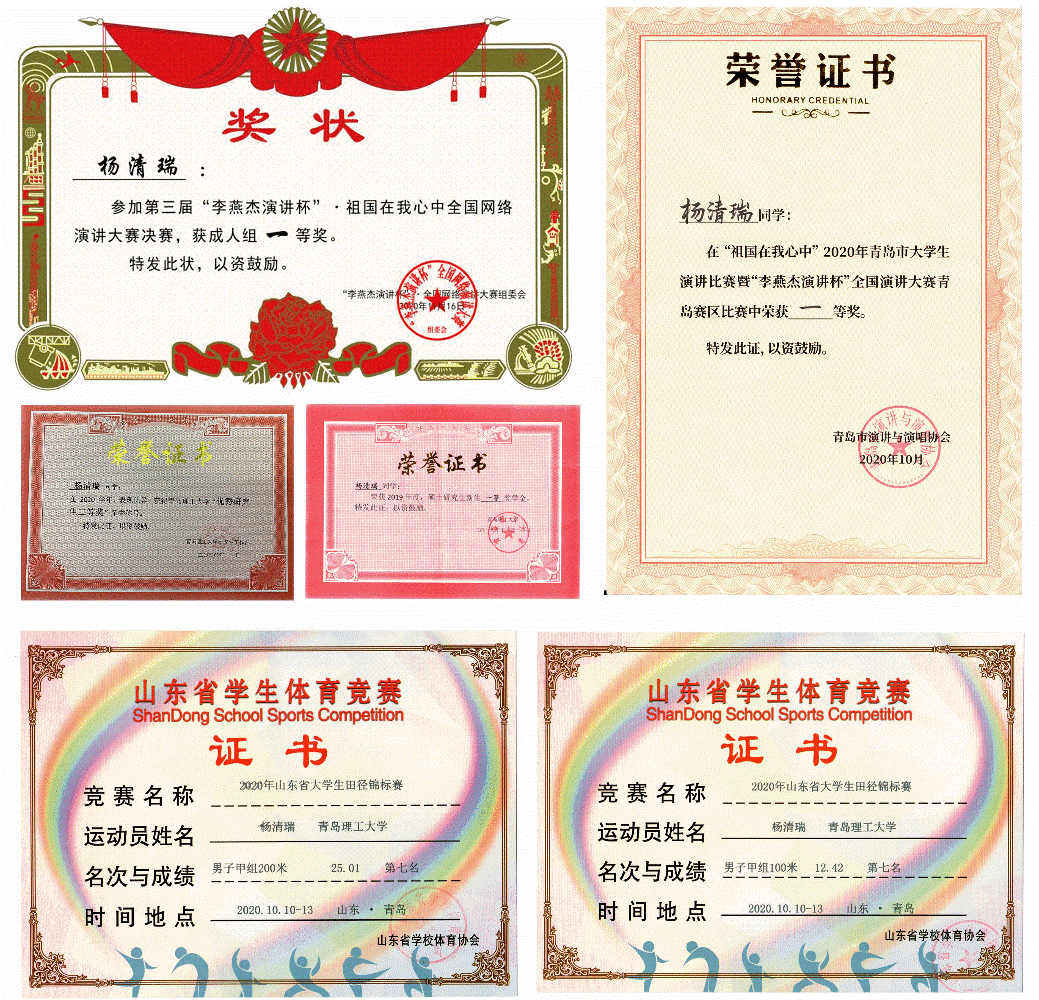 综合素质方面:他兴趣广泛,文体兼修,积极参与各项活动,努力实现自身素质全面发展。他热爱体育运动,曾代表ky开元集团参加2020年山东省大学生田径锦标赛并取得男子甲组100米总成绩第七名、男子甲组200米总成绩第七名的佳绩。他热爱演讲,曾获得2020年青岛市大学生演讲比赛一等奖、第三届“李燕杰演讲杯”全国演讲大赛一等奖。