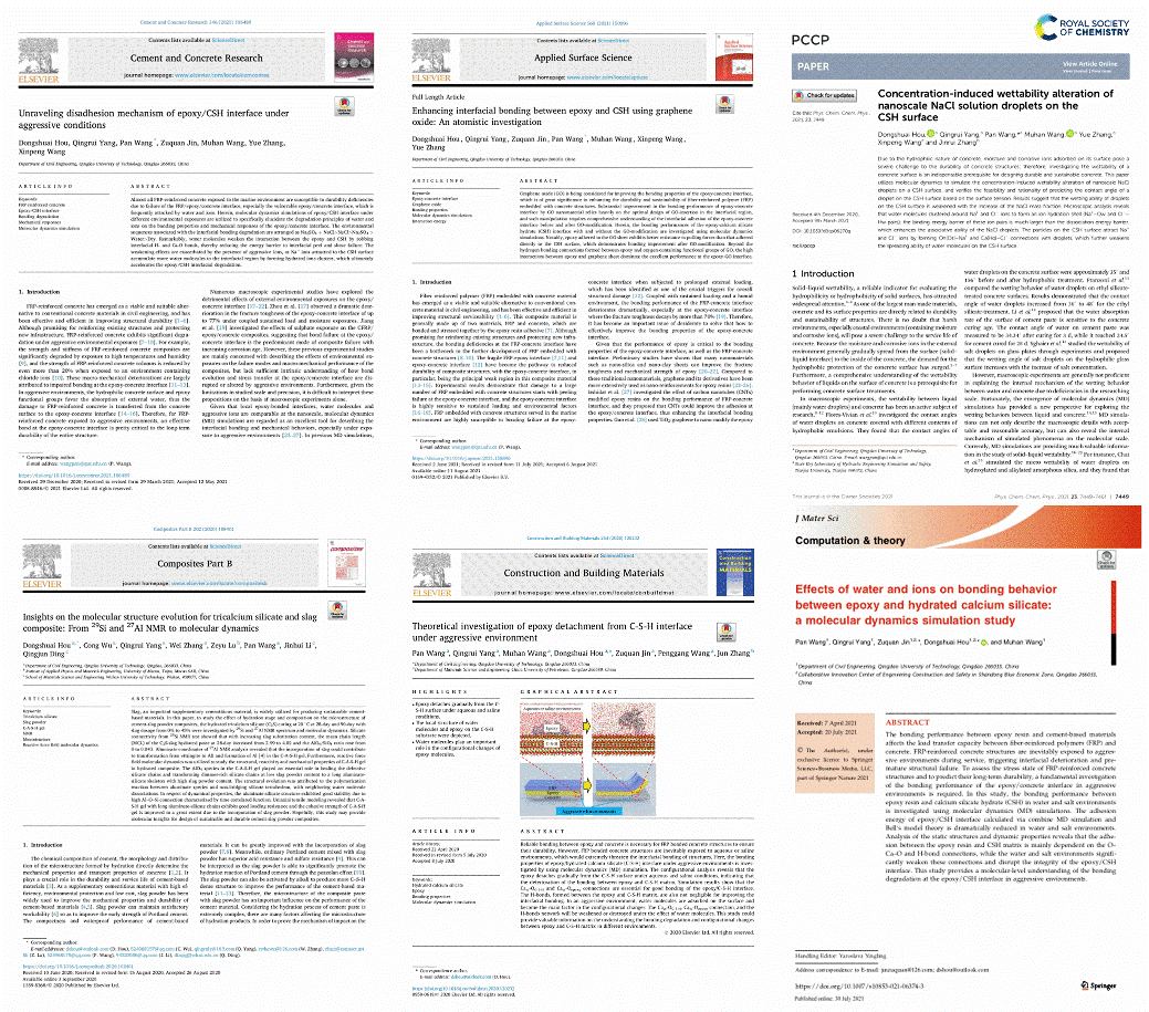 [1]. D.S. Hou, Q.R. Yang, P. Wang*, Z.Q. Jin, M.H. Wang, Y. Zhang, X.P. Wang, Unraveling disadhesion mechanism of epoxy/CSH interface under aggressive conditions, Cement and Concrete Research, 146 (2021) 106489.