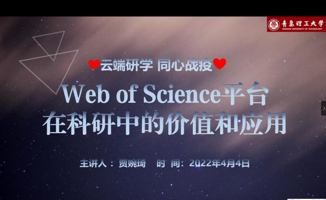 研究生“云端研学 同心战疫”线上讲座继续进行。4月4日晚,第七场讲座由毕业于日本东北大学情报科学研究科的贾婉琦带来《Web of Science平台在科研中的价值和应用》的专题报告,350余名研究生参会。
