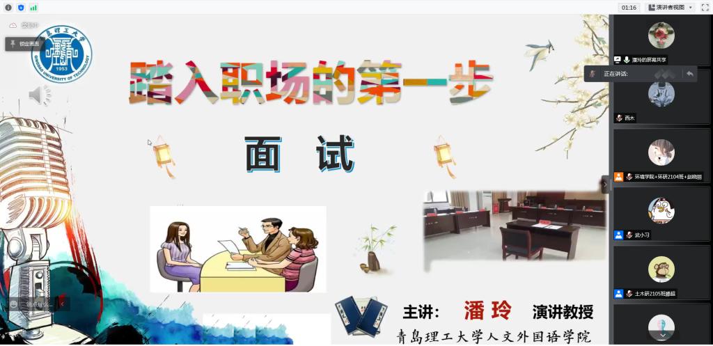 探索职场,做好充足准备。“老师,我打算一毕业就去工作,如果想更好地走入未知的职场,能做点什么呢?”人文与外国语学院潘玲以《踏入职场第一步——面试》为题,系统地说明了职场需要什么样的人才,如何将自己在面试过程中展现得淋漓尽致,并将自己独到的面试经验与见解毫无保留地分享给了大家,为未来同学们的求职、面试打下了坚实的基础。