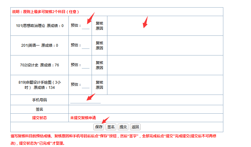 (二)考生须认真填写复核申请相关内容:按要求在复核科目的预估成绩、复核原因和手机号码等栏目填写相关信息,经本人仔细核对无误后点击保存,原则上每个考生最多可提出复核2个科目申请(任意)。